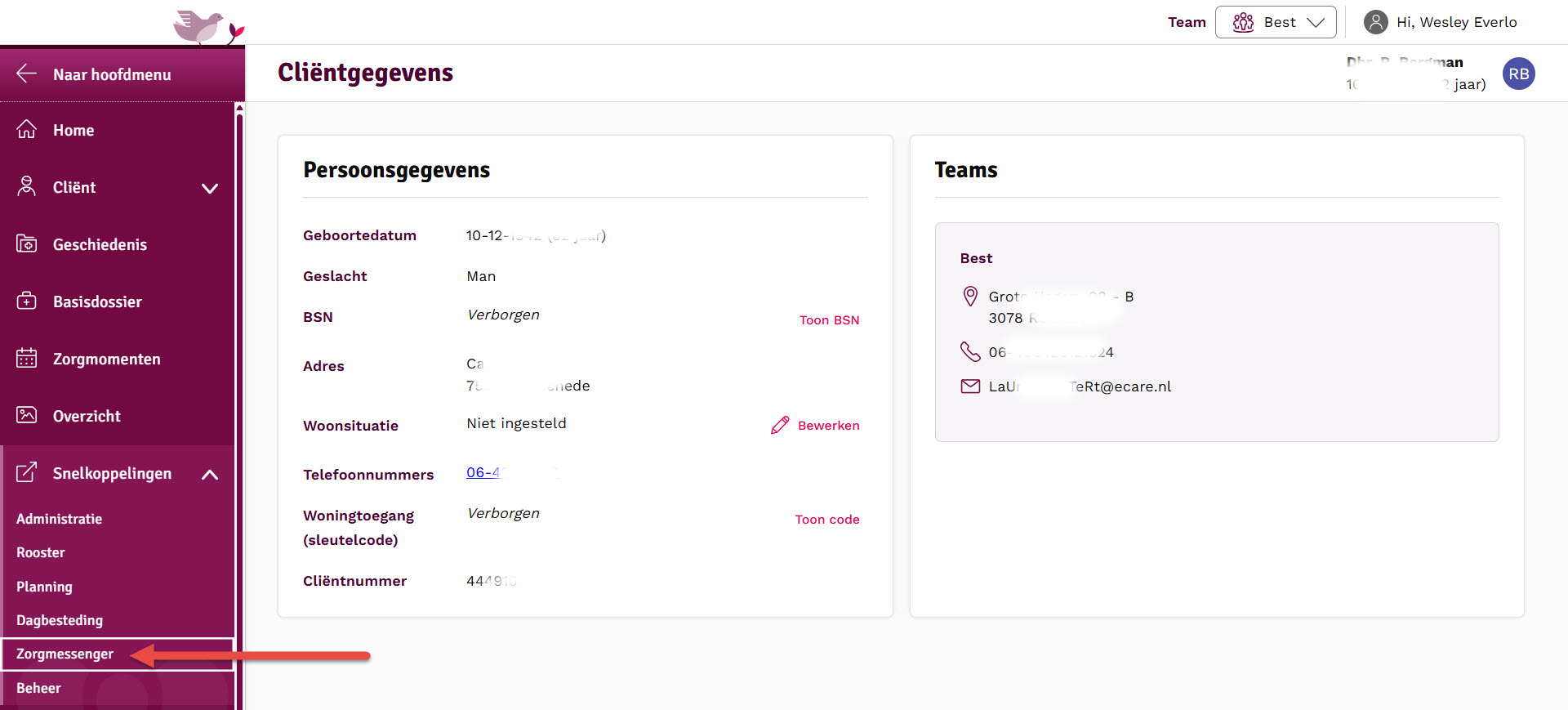 Stap 1: Log in op Zorgmessenger en ga naar de optie "Berichten". Zie je dit niet staan, dan moet de organisatie de module zorgmessenger nog activeren voor het wijkteam Hierna verschijnt er in het dossier een extra optie "Berichten"