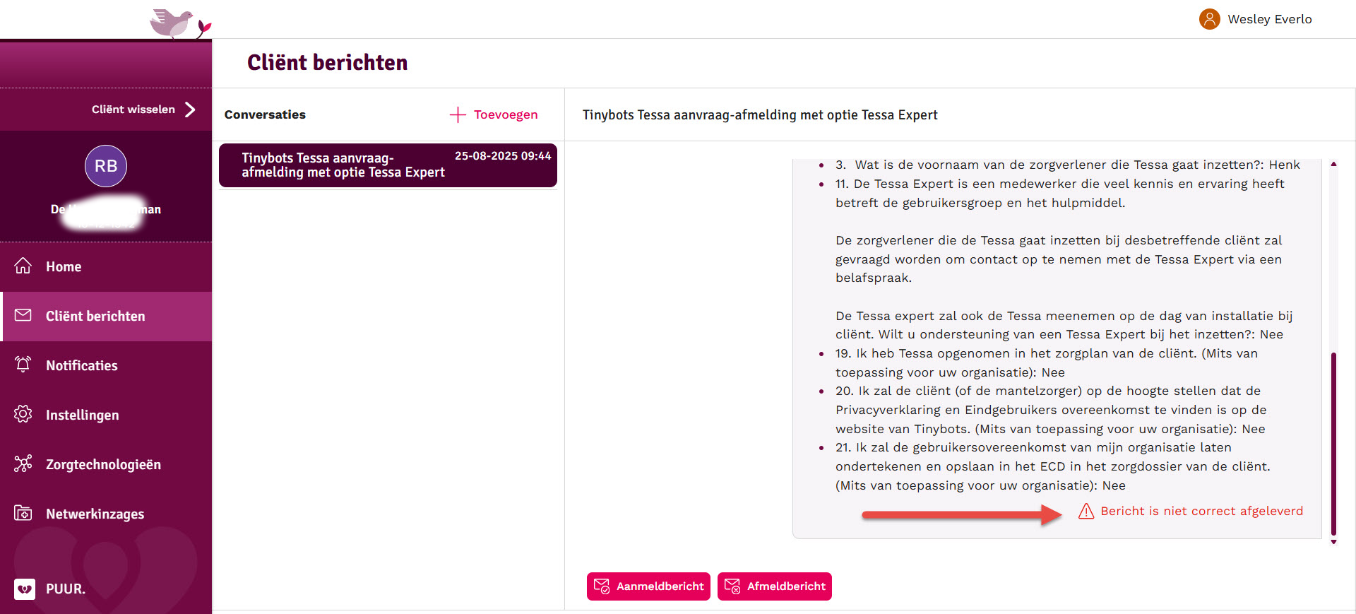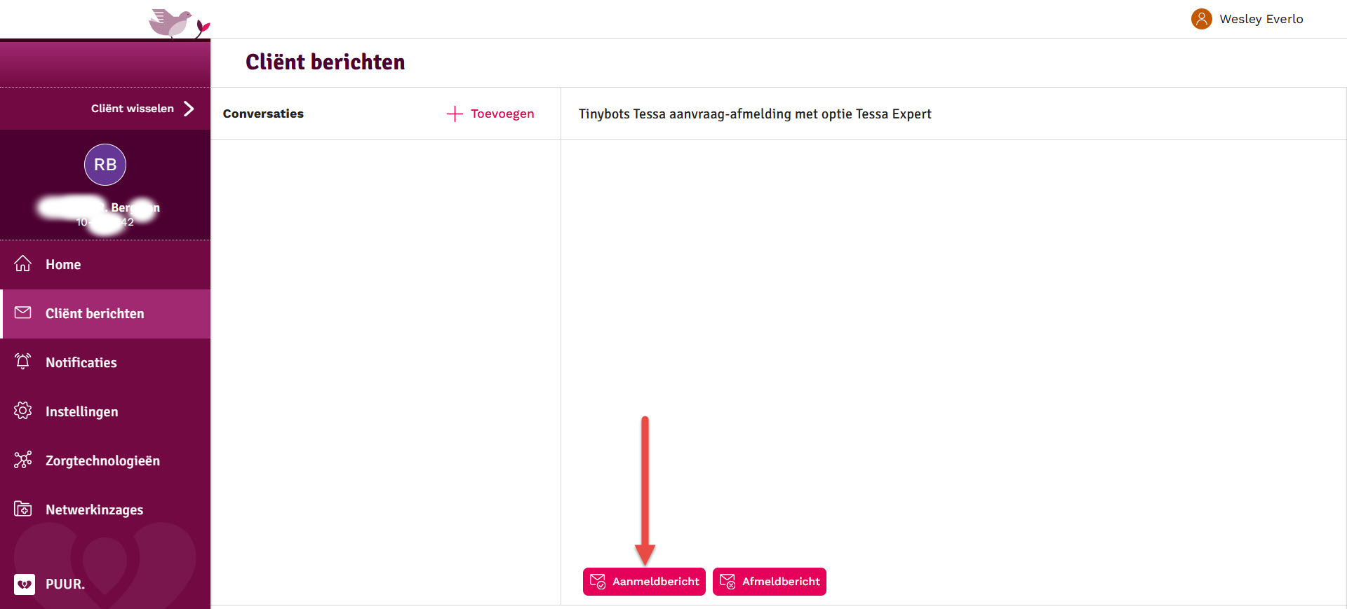 Om een cliënt af te melden selecteer je de conversatie waarin het aanmeldbericht staat en klik je op 'Afmeldbericht':