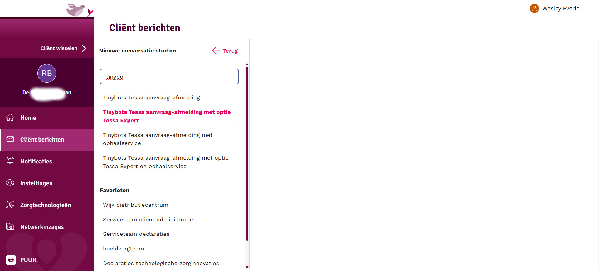 Stap 2. Zodra je op de 'Berichten' knop klikt, wordt je direct doorgeleid naar PUUR. zorgmessenger voor de wijk. Via de envelop wordt er een nieuwe conversatie gestart. In het adresboek kan gezocht worden naar Tessa, hier selecteer je het product dat je wilt inzetten